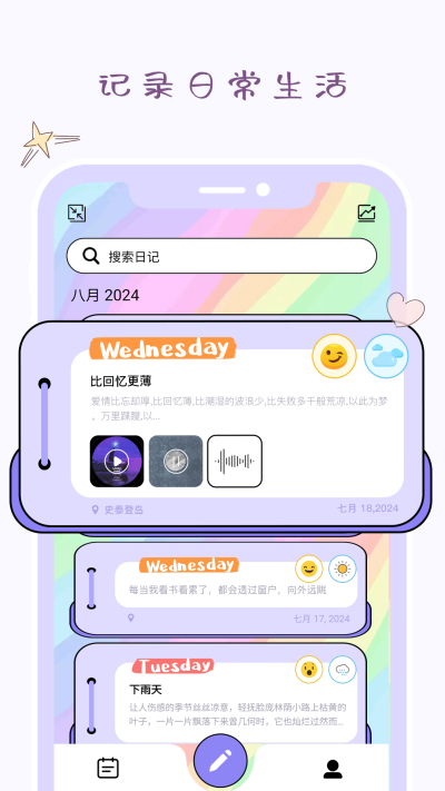 2. 时间轴与日历视图回顾:对于希望进行周期性自我回顾的用户,单纯的列表式查看效率低下。该功能提供了按时间轴线性浏览和按日历点选查看两种模式。通过日历视图快速定位到任何一天的记录,而时间轴视图则能直观展示记录频率和情绪变化的宏观脉络,解决了海量日记内容难以系统性检索和回顾的痛点。