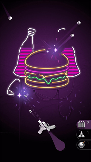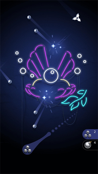 操作方式直观易懂:屏幕下方是发射器,玩家通过手指拖拽来控制发射的方向和力度,松手即可将弹射物射出。弹射物在碰到霓虹物体或关卡边界时会发生反弹,利用好反弹物理是通关的关键。