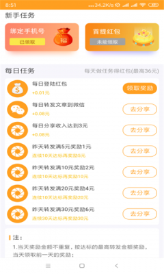 任务中心与收益系统: 这是应用的核心价值转化功能。任务中心清晰罗列每日可完成的各类任务,如阅读5篇文章、观看10个视频、分享3次到朋友圈等,并明确标注每项任务的奖励金额与完成状态。收益系统则实时展示累计收益、可提现金额及明细记录。该功能直接解决了用户寻求灵活、低门槛增收渠道的痛点。它将抽象的赚钱目标具象化为一系列可执行、可追踪的小步骤,降低了用户的认知负担和行动门槛,并通过可视化的收益增长持续激励用户参与。
