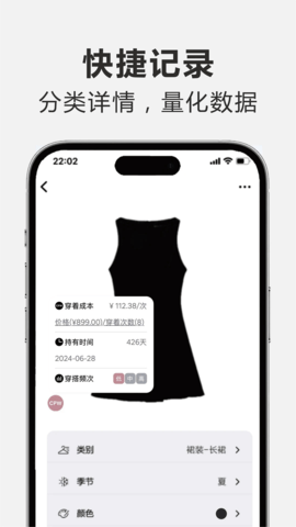 购物与消费分析:软件提供服饰消费记录模块,用户可录入单品的购买日期、价格及店铺信息。长期积累后,系统可生成消费分析报告,展示用户在各类别服饰上的支出分布、品牌偏好及购物频率趋势。结合衣橱内单品的实际使用频率数据,该功能有助于用户识别高价值与低使用率单品,引导其进行更理智、可持续的消费决策。