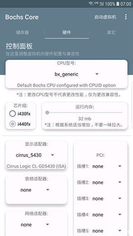 软件提供了极致的可配置性与透明度。用户不仅能够调整内存大小、CPU数量等常规参数,更能深入配置芯片组型号(如i440FX)、BIOS版本、显卡的显存大小及VESA模式支持,甚至模拟特定的声卡(如Sound Blaster 16)和网卡(如NE2000)。这种粒度的控制允许用户为特定的操作系统量身定制硬件环境,解决了因硬件抽象层过高导致的驱动不兼容或性能异常问题,是进行精确系统复现和故障诊断的关键。