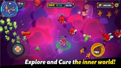 亮点二:深度结合的医疗策略与塔防玩法。 游戏中的防御单位均是医疗概念实体化。抗体塔针对特定病毒进行精准打击,巨噬细胞作为近战单位吞噬小型病原体,修复无人机则负责治疗被损伤的健康细胞以维持防线血量。玩家需要像真正的医生一样诊断关卡中的主要病原体类型(病毒、细菌、纳米机械),对症下药地搭配防御塔阵容,实现了玩法与主题的完美统一。