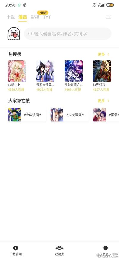 2. 资源分类导航与热度榜单: 软件提供按漫画、小说、影视等大类进行的资源分类导航,并设有实时或周期性的热度榜单(如24小时热门、本周最火)。对于没有明确搜索目标的用户,可以通过浏览分类和榜单来发现当前流行的内容,解决了剧荒、书荒时的选择困难,起到了内容导流和趋势发现的作用。