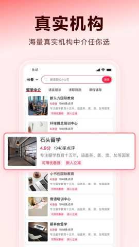 机构搜索与高级筛选功能:用户可通过目标语言、目标国家、课程类型(一对一、小班、大班、在线、面授)、价格区间、开课时间、特定教学目标(如雅思口语、商务写作)等多个维度进行交叉筛选。此功能解决了用户在海量机构中盲目寻找,效率低下的痛点,快速聚焦符合硬性条件的可选范围。