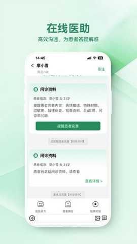 在线问诊与沟通:提供安全的实时图文、语音沟通通道,支持图片、报告单等文件传输。此功能解决了患者复诊或轻症咨询需频繁往返医院的痛点,尤其为异地患者或行动不便者提供了极大便利。医生可随时随地进行异步处理,充分利用非坐诊时间,显著扩展了服务半径和时间弹性。