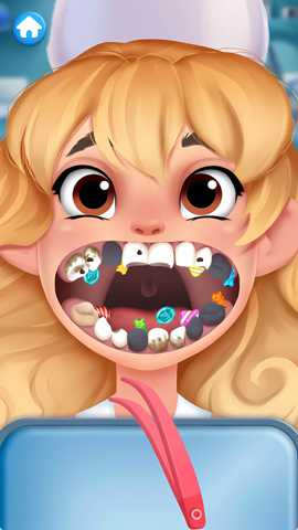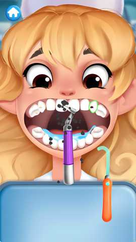 具体治疗操作: 针对不同问题,操作各异:1. 对于牙垢,玩家需选中旋转牙刷或抛光器,在牙齿表面进行连续、快速的点击或划动摩擦,直到黄色污垢全部消失,牙齿恢复亮白。2. 对于蛀牙,则需要先选中小钻头清理腐坏部分(这里以温和的震动动画表现),选择彩虹凝胶补牙材料,点击蛀洞进行填充,用固化灯照一下使其牢固。3. 对于松动的乳牙,最考验手法,玩家需选中软胶钳,轻轻拖拽钳子夹住牙齿,平稳地向上或左右拖动(有时会有需要保持稳定数秒的小挑战),牙齿便会轻松脱落,过程中小患者会露出放松甚至微笑的表情。