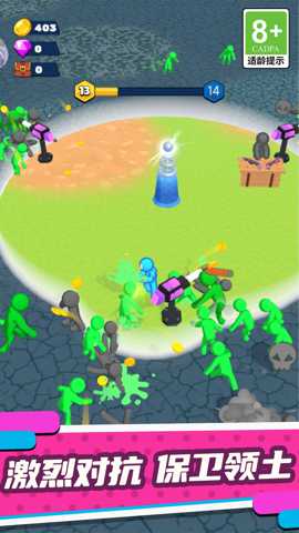 亮点二:领地争夺与塔防进化的创新融合。 游戏并非单纯的无双割草,而是巧妙融入了战略元素。玩家需要主动出击消灭敌方据点(如飞碟),将安全区向外扩展。己方基地的铁塔需要不断升级以抵御敌人反扑。这种攻守一体的玩法,要求玩家在激进进攻与稳健防守间做出平衡决策,相较于传统线性闯关或纯塔防游戏,策略深度和局势多变性大大增强。