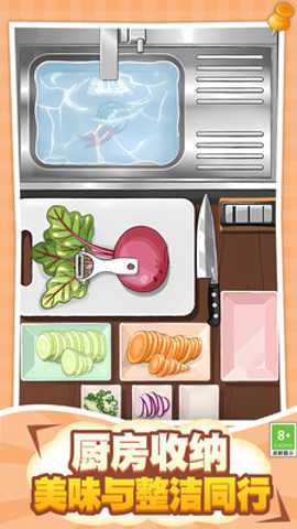 游戏的核心玩法围绕观察、规划、执行、优化四个步骤展开。进入关卡后,首先呈现在玩家眼前的是一个物品散落各处的特定场景(如一个堆满食材和厨具的厨房)。玩家的主要目标是:在规定时间内,将所有物品放入正确的、指定的收纳区域,并使最终布局尽可能整洁、合理、美观。