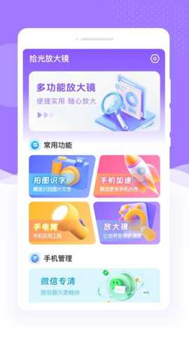 拾光放大镜是一款集光学放大、图像文字识别、系统优化及实用工具于一体的综合性移动应用,其核心功能在于利用手机摄像头实现高倍率、高清晰度的实时放大观察,并整合了拍图识字、手机加速与清理、手电筒等辅助工具,通过技术手段解决用户在微观观察、信息获取、设备维护及特定环境照明等方面的日常需求,提升移动设备的实用性与用户的生活及工作效率。