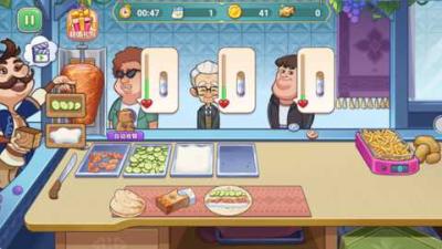 主要玩法与操作方式: 游戏以天为单位推进。每天开始前,你需要在市场进行食材采购和补充库存。营业开始后,顾客会陆续进店,头顶出现带有食材图标的订单气泡。你的核心操作是:点击顾客接收订单 -> 按照顺序点击厨房台面上的食材进行处理(如点击肉饼开始煎烤)-> 将处理好的食材拖拽到饼皮上 -> 点击完成并进行卷饼 -> 将成品拖拽给对应的顾客。整个过程需要眼明手快,因为多个订单会进行,且食材处理有倒计时,煎糊的肉或放久的蔬菜会影响成品质量。你还需要随时点击收银台为用餐完毕的顾客结账,并清理餐桌迎接下一位客人。