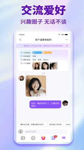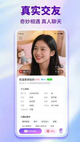 2. 动态资料页与真人认证功能:该功能解决线上社交真实性危机和信任建立难的痛点。动态资料页允许用户上传生活照片、发布状态更新,比静态文字更能立体展示个人特质。结合强制性的真人认证流程,构成了可信度的双重保障。对于用户而言,在发起对话前,能够通过一个经过验证且内容丰富的资料页对对方形成初步认知,从而做出更理性的互动决策,减少了因信息不对称导致的无效沟通或安全顾虑。