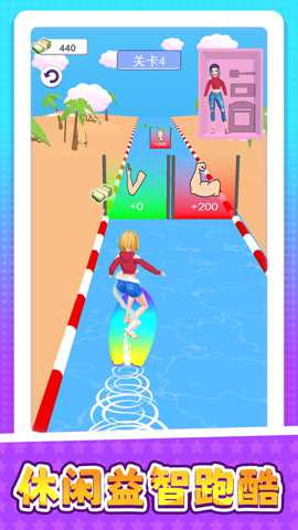 核心操作与竞赛目标: 游戏采用直观的触屏操控。在比赛过程中,玩家通过左右滑动屏幕控制角色横向移动,上滑跳跃,下滑滑行,长按可实现二段跳等高级动作。玩家的主要目标是尽可能快地到达终点,在赛道上收集三种关键资源:彩虹币(通用货币)、创意星尘(剧情和建造资源)以及随机的物资箱(内含各种装饰和机关部件)。赛道上布设有加速带、跳跃板等助力机关,也设有障碍物、陷阱等挑战,需要玩家快速反应,灵活操作。