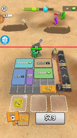 主要操作方式: 整个游戏界面干净简洁。屏幕下方是玩家的子弹库,里面会不断生成基础等级1的子弹。屏幕上方或侧方是发射口。玩家需要做的,就是用手指将子弹库中的子弹拖拽到发射口,即可自动发射攻击正在前进的僵尸。当有多个相同等级(如两个1级手枪子弹)的子弹时,将它们相互拖拽重叠,即可合成为一个更高等级(2级)的新子弹,再将其拖至发射口,火力便会显著增强。
