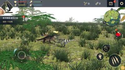 主要玩法与操作方式:游戏采用俯视角进行。左侧虚拟摇杆控制恐龙移动,右侧设有攻击键(通常为普通撕咬或撞击)以及一个可释放的专属技能键(如冲撞、咆哮、加速等)。玩家的基本操作流程是:操控恐龙在地图中移动,寻找并捕食比自己弱小的生物(如小鱼、小恐龙、原始哺乳动物)。成功捕食后,屏幕下方的进化能量条会增长,攒满后即可在进化界面选择解锁新的、更强大的恐龙形态。随着形态升级,恐龙的生命值、攻击力和技能都会得到强化。地图中不仅散落着食物,也存在其他掠食者或强大生物,玩家需要灵活走位,规避危险,或利用技能进行智取。