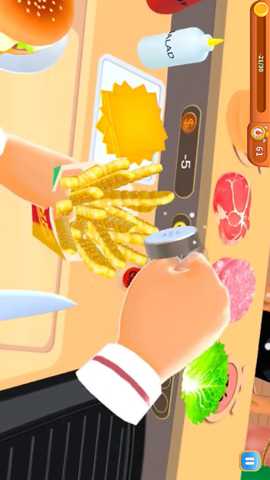 1. 核心烹饪操作流程: 游戏以关卡模式推进。每个关卡代表一个营业时段。开始后,顾客会陆续进入餐厅就坐。其头顶会弹出包含菜品名称和具体需求的气泡(如经典牛肉汉堡,不加洋葱)。你的操作流程是:点击该气泡接单;进入第一人称厨房界面,依照顺序:
