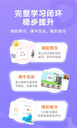 2. 互动式课堂与即时练习:课堂界面集成了视频、动画、可操作教具和互动游戏。在单词学习环节,儿童需要通过点击、拖拽等操作完成配对或分类游戏,即时巩固记忆。在对话练习中,AI虚拟伙伴会发起提问,儿童需进行口语回答,系统即时给出发音反馈。此功能解决了传统学习中练习形式单一、反馈滞后的问题,将知识内化过程变得高效且有趣。