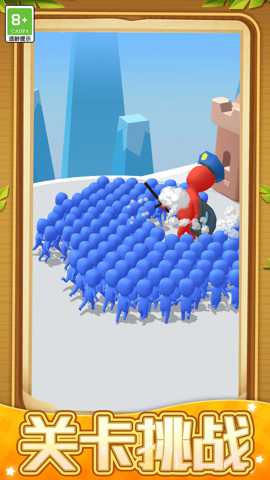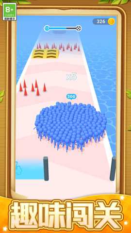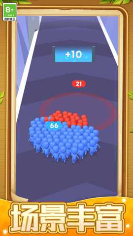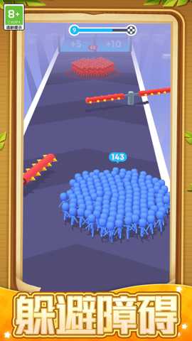 游戏中的核心挑战来自两个方面:一是传统的环境障碍,如钉刺、深坑、摆锤、移动高墙等,需要精准操作避开,一旦本体撞上障碍即告失败;二是敌对的小红人群体。它们会成队出现在跑道上,与玩家相向或同向奔跑。当双方队伍接触时,会进入即时对战计算:若玩家队伍数量大于小红人队伍,则成功将其碾压吸收,并继续前进;若数量小于或等于,则玩家队伍会损失相应数量的小人,若本体光杆则更容易被后续障碍击败。玩家的核心策略在于:在保证生存的前提下,最大化收集中立小人以壮大队伍,从而在面对小红人军团时拥有碾压性的数量优势,并利用操作技巧在复杂地形中保存有生力量。