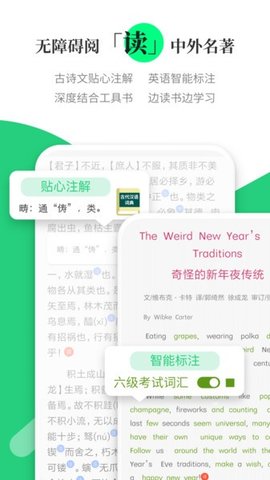 2. 名著文本深度嵌入与交互式阅读:软件内置的中外名著并非简单的电子书,而是进行了深度数字化处理的文本。每一部作品都实现了词汇级的数据关联。用户点击文中任意生词或短语,即可获得即时释义。更重要的是,系统会为经典篇章或复杂段落提供背景注释、文体风格分析、长难句语法拆解等扩展资料。此功能解决了读者在阅读原版著作时因语言障碍和文化背景知识缺乏而导致的阅读中断和理解困难,使独立阅读高阶文学作品成为可能,并在阅读中自然习得高级词汇和复杂句式。