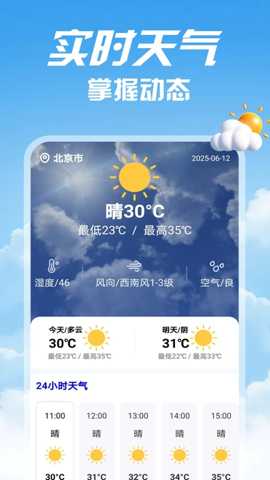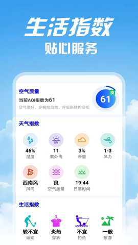 1. 实时天气与生活指数功能:此功能直接解决了用户现在出门该如何穿戴的即时需求。界面清晰展示当前温度、体感温度、天气现象(晴、雨、雪等)、湿度、气压、风速与风向、能见度以及日出日落时间。它集成了多项专业生活指数,如穿衣指数、感冒指数、运动指数、洗车指数、花粉浓度等。这些指数由气象数据与人体舒适度模型结合生成,为用户提供具体的行动建议,高花粉浓度指数会提示过敏人群减少户外活动。