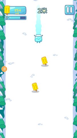 主要目标与操作方式: 玩家的核心目标是操控冰块角色在一条自动向前滚动的无尽冰道(或固定长度的关卡赛道)上尽可能远地滑行,并最终抵达关卡终点。基础操作极为简洁:左右滑动屏幕控制角色横向移动,用于拾取冰棍和躲避障碍;向上滑动屏幕执行跳跃,可以越过低矮障碍或沟壑;在某些特定场景可能需要快速向下滑动以执行下蹲,穿过低矮通道。屏幕上方的核心UI是温度计量表,其数值随着时间推移和接触热源(如阳光区域、岩浆地板)而上升,通过收集黄金冰棍来下降。计量表清空即角色完全融化,游戏结束。