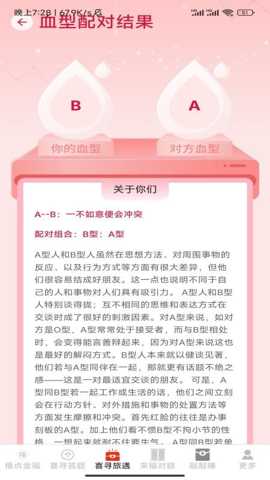 第二,基于多维数据的轻社交匹配系统。喜寻旅遇模块中的血型匹配功能,是软件在轻量化社交领域的一次尝试。它并非依赖复杂的用户画像分析,而是选取了一个具有大众认知基础且趣味性强的标签(血型)作为初始连接点。该功能通过预设的配对算法,为用户生成一份趣味性的匹配报告。这种低压力、高趣味的破冰方式,降低了陌生社交的初始门槛,为用户提供了开启话题的契机,从单一标签出发,引导用户发现更深层次的共同兴趣,从而探索建立新型社交关系的可能性。