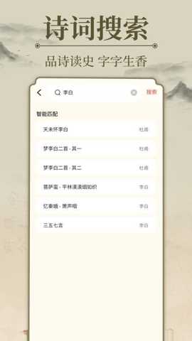 1. 精准检索与高级筛选功能:解决痛点:诗词库庞大,查找特定作品或某一类作品困难。用户不仅可以通过标题、作者、诗句进行全文检索,更能使用多条件组合筛选。按朝代(唐、宋)、作者性别、题材(山水、边塞、咏物、怀古)、具体词牌名或诗体(五律、七绝)、包含特定意象(如月、柳、酒)等进行精细化查找,快速定位目标资源,极大提升了研究或兴趣阅读的效率。