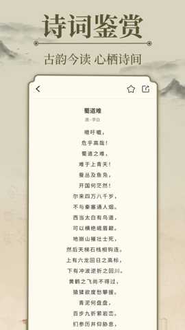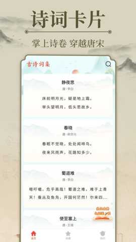 四、沉浸式创作背景还原与意境渲染:利用多媒体技术,软件为重要诗词作品配套提供了丰富的背景资料与意境渲染内容。这包括历史地图标注创作地点、相关历史事件时间线、传统国画或书法作品配图,甚至部分名篇配有专业的朗诵音频或古典音乐背景。这种多模态的信息呈现方式,还原诗词创作的历史文化语境,辅助用户跨越时空,更深刻地感知诗词的情感内核与艺术境界。