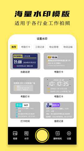 1. 智能场景识别与模板推荐:痛点:用户在特定场景(如签收货物、记录健身)下,需要快速找到合适的水印,但面对海量模板往往无从下手。解决方案:软件利用图像识别初步分析拍摄画面内容,并结合时间、位置数据,智能推荐最相关的两到三个水印模板。在检测到办公桌和文档画面时,优先推荐工作打卡、合同签署类模板,极大提升了操作效率。