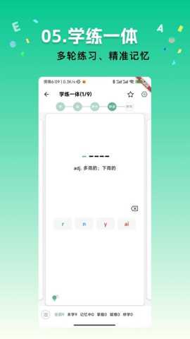 2. 沉浸式学习与练习模块:该模块包含初次识记、听音辨义、拼写强化、例句填空、词义匹配等多种交互式练习题型。每种题型针对词汇掌握的不同维度进行训练,听音辨义强化听觉词汇,拼写强化攻克拼写难关。练习过程中,系统会根据用户答题的正确率与速度,实时调整题目难度与出现频率。这种高强度、多感官参与的交互练习,有效对抗记忆遗忘,将短时记忆转化为长时记忆。