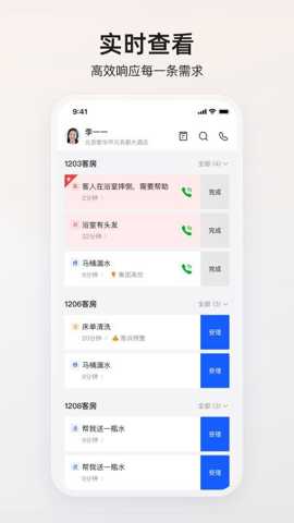 系统实现了服务流程的全链路可视化与实时监控。从住客或员工发起请求生成工单开始,到派发、接单、处理中、完成、确认关闭的每一个状态节点,都会在系统中实时更新并全局可见。管理人员可以通过后台看板一目了然地掌握所有工单的实时状态、处理时长、积压情况。对于一线员工而言,其个人终端会清晰展示已派发、待处理、进行中的任务列表及优先级。这种透明化的流程管理,使得服务进度不再是黑箱,极大增强了管理的可控性和员工的责任感,也为后续的服务质量考核提供了客观依据。