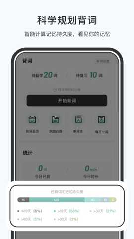 核心背词功能:用户启动背词模块后,将进入由算法驱动的个性化学习流。每个单词的学习单元通常包含标准发音、中英文释义、例句语境及词根词缀解析。系统会根据历史数据智能呈现新学单词与待复习单词的组合,用户在完成识别、选择、拼写等交互后,需对自身掌握程度进行主观评级,该评级将成为算法调整下一次复习时间点的重要依据。此功能直接解决了学习者盲目背诵、复习节奏混乱的痛点,将记忆规律外化为可执行的程序。