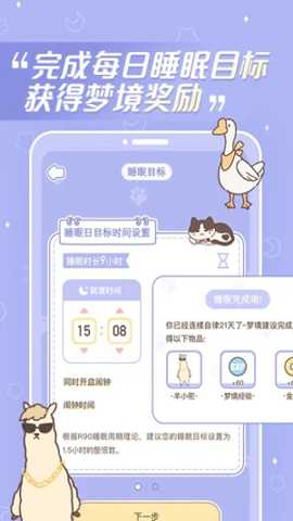 2. 个性化睡眠目标与挑战设定:用户可根据自身情况,设定每周或每日的入睡时间目标、睡眠时长目标。软件将目标分解为每日任务,并通过完成打卡的方式进行追踪。该功能将宏大的改善睡眠目标拆解为具体、可执行、可评估的微小行动,降低了启动门槛,并提供了清晰的进展反馈,对抗行为拖延。