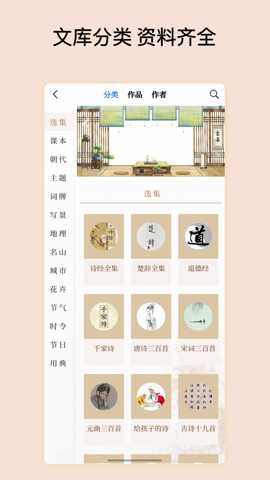1. 结构化分类检索与资源库功能:软件提供了极其细致的诗词分类体系,包括按朝代、作者、选集(如唐诗三百首、宋词三百首)、教材课本、主题(如咏物、抒怀、边塞)、词牌名、写景类别、常用典故等多个维度进行归类。这一功能解决了用户想系统学习却不知从何开始或想找特定类型诗词却无处可寻的痛点。根据自身的学习计划或兴趣点,快速定位到目标学习资源,构建个性化的学习路径。