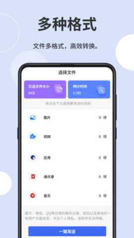 一键互传省心换机是一款由长春小火花文化有限公司研发的专业级跨设备数据迁移解决方案,其核心功能在于实现新旧移动设备间各类用户数据的快速、安全、无损传输。软件通过高效的本地网络传输协议,支持包括图片、视频、音频、联系人、应用数据及各类文档在内的全类型文件迁移,彻底简化用户更换手机时的数据转移流程,将传统繁琐的备份恢复操作转化为直观的一键式体验,显著提升换机效率并保障数据完整性。