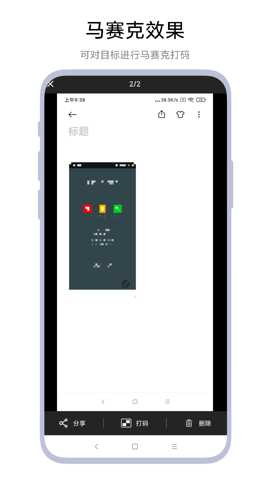 全局快速截图与即时编辑: 该功能解决了传统截图后需保存至相册,再导入其他编辑软件进行处理的繁琐流程痛点。用户通过通知栏或悬浮球触发全局截图后,所截图像直接进入本软件的编辑界面,省去了中间的文件存储与查找步骤。对于需要即时打码并分享的沟通场景(如在线反馈问题、即时通讯中分享已脱敏信息),此功能将操作路径缩短至极致,提升了响应速度。