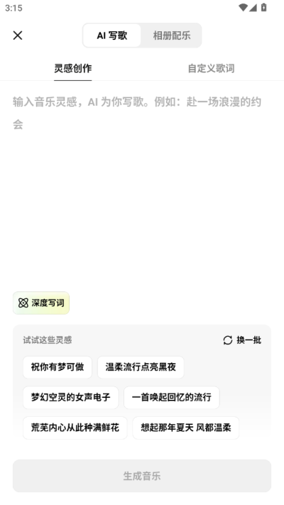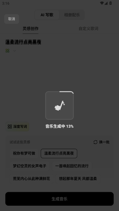 1. 灵感关键词驱动音乐生成: 此功能直接针对创作无从下手的痛点。用户无需具备乐理知识或乐器演奏技能,只需从系统提供的风格、心情、场景等标签库中选择或输入自定义关键词,即可触发AI生成引擎。系统会将这些语义信息转化为具体的音乐参数(如调式、速度、配器),生成一段完整的音乐片段,解决了创意启动阶段的障碍。