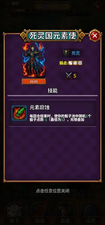 亮点三:富有挑战且设计精巧的敌人生态。 游戏拥有超过九十种怪物与首领,它们绝非数值堆砌的沙包。每种敌人不仅拥有独特的攻击模式和行为逻辑,其弱点也各不相同——有的惧怕特定元素,有的甚至对奇数点或大于4的点数存在额外弱点。这迫使玩家不能固守一套骰子组合走天下,必须根据当前遭遇的敌人,灵活调整投掷策略和骰子池的构成,时刻保持思考,挑战性十足。