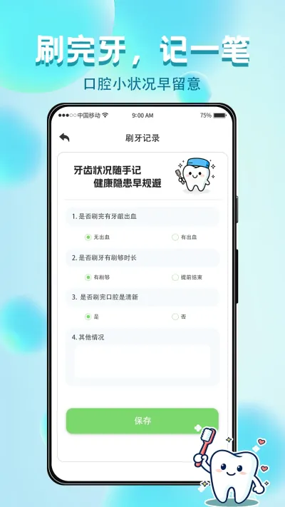 2. 精细化症状与行为记录功能:针对口腔问题发展隐匿,用户难以察觉早期征兆以及就诊时无法向医生清晰描述病史的痛点。用户可在每次护理后,在记录页面详细录入本次刷牙的准确时长,并勾选是否有出血、肿痛、敏感等症状选项,还可添加文字备注。这些数据形成连续的个人口腔日志,帮助用户早期发现异常模式(食用特定食物后频繁出血),也为牙医提供了宝贵的连续性病史资料。