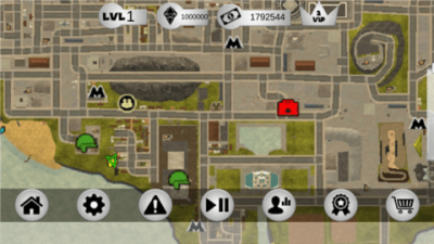 主要操作方式: 游戏采用经典的虚拟双摇杆控制。左侧虚拟摇杆负责控制火柴人英雄的移动,向前推并按住可实现加速奔跑。右侧则集中了大部分动作按键:最核心的绳索按键,点击后屏幕上会出现瞄准图标,将其对准建筑物边缘或其他锚点再次点击,即可发射绳索进行摆荡或攀爬;攻击键负责近战拳脚与射击(根据手持武器自动切换);跳跃键可实现基础跳跃,与绳索结合能完成更复杂的空中动作。屏幕右上角设有便捷的武器轮盘,可实时切换已装备的各种枪械,生命值、经验条和通缉星级等重要信息也清晰展示于此。