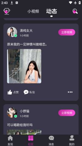 动态社区与多媒体表达功能:用户可通过图文或短视频形式发布个人动态,软件特别提供黑眼圈主题的创意滤镜,鼓励用户分享熬夜日常、心情状态或兴趣内容。动态支持公开点赞、评论互动,形成了一个以用户真实生活片段为核心的微型社区。此功能解决了用户仅通过静态资料页难以立体展示自我的问题,为他人的互动提供了更丰富、更自然的切入点,从看资料转向看生活,促进了基于共同兴趣或状态的情感连接。