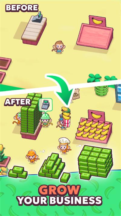 4. **高自由度个性化与离线收益系统**:游戏鼓励玩家发挥创意,提供了丰富的装饰物和布局选项,你可以随心所欲地设计超市的每一个角落,打造风格迥异的猴子王国,满足每个人的审美和创造欲。贴心的离线收益系统让忙碌的现代玩家无需担心进度落后,即使退出游戏,你的超市也会持续稳健地产生基础收益,下次上线即可一键领取,真正做到轻松游戏,无压成长。