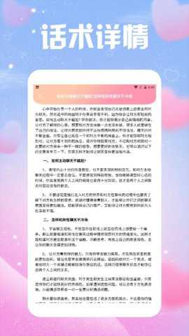 海量话术库与情话套路:软件提供了按场景、关系、目的分类的庞大话术数据库,并包含持续更新的情话套路合集。此功能直接针对用户在追求心仪对象或经营亲密关系时,常常面临灵感枯竭、表达单调或不合时宜的痛点。通过检索和浏览,快速找到适配当前沟通情境的参考文本,降低即时构思的心理压力。