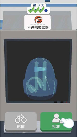 2. 人身与随身行李检查:通过证件查验的旅客将进入安检区域。玩家需要指挥旅客将随身行李放入X光机,旅客本人通过金属探测门。X光机屏幕是游戏的核心操作界面,行李中的物品会以不同颜色的轮廓重叠显示。玩家需要点击可疑物品进行局部放大,并可旋转物品从多个角度观察。根据颜色提示(通常深蓝为金属,橙色为有机物,绿色为混合物)和形状,判断是否为违禁品。若发现违禁品,需点击标记并选择相应的处置方式(如没收、放行需进一步开包检查等)。