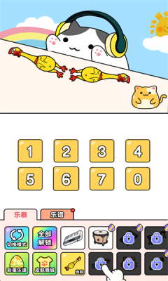 玩家核心目标与成长路径:玩家的短期目标是成功完成每一首乐谱的挑战,获得高分评价,并赚取游戏内货币或奖励。长期目标则是收集全部猫咪伙伴、解锁所有乐器与精美皮肤。乐器与皮肤的解锁主要通过全部解锁功能实现,该功能提供随机解锁1个、随机解锁5个等选项,玩家通过完成日常任务或选择观看激励广告即可获得解锁机会,这种带有惊喜感的机制增加了收集的乐趣。彩蛋乐谱模块会定期更新时下流行的热门曲目或特殊风格的乐谱(如DJ神曲、民族舞曲等),为玩家带来持续的新鲜挑战。